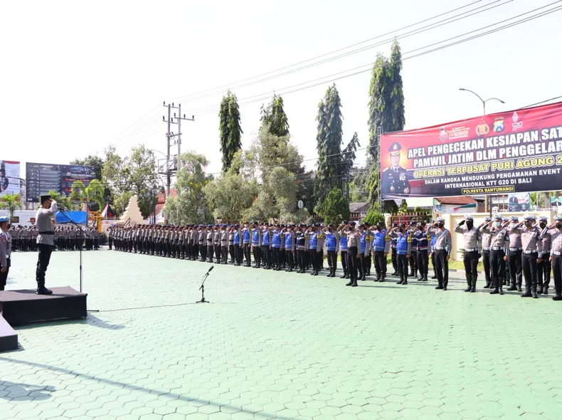 Sebanyak 380 personel Polresta Banyuwangi dari berbagai satuan kerja telah disiapkan, baik dari Satuan Reserse Kriminal, Satnarkoba, Satlantas, Bagops, Samapta serta lainnya dalam rangka mendukung pengamanan Event International KTT G20 pada 15 – 16 November 2022 mendatang. [TIM]