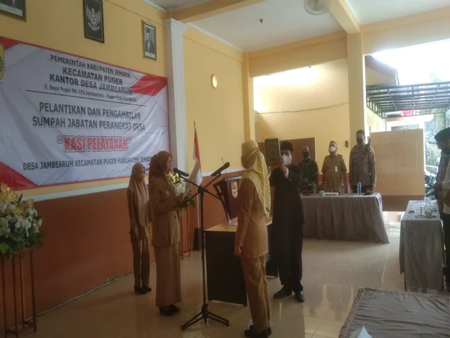 Jember, POJOKSEMERU.COM – Kepala Desa Jambearum lmro’ Ati BA melantik dan mengambil sumpah jabatan yang baru kepada Nailil Munasari untuk menjadi Kasi Pelayanan yang baru. Acara pelantikan yang digelar di aula pendopo Kantor Desa Jambearum Kecamatan Puger Kabupaten Jember pada Selasa, (29/3/2022).